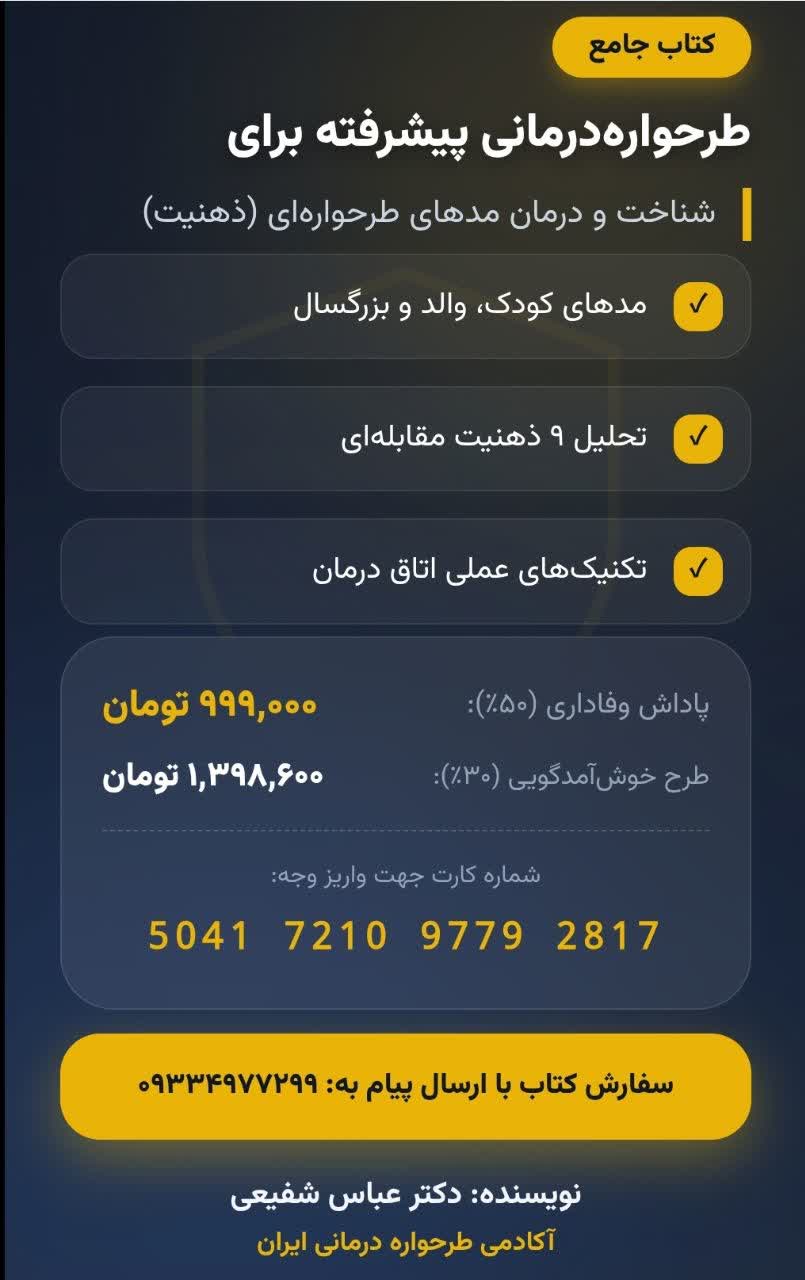 نوشته دکتر عباس شفیعی اگر طرحوارهدرمانی بلدی اما در جلسه درمان نمیدانی دقیقاً از کجا شروع کنی و چه مداخلهای انجام بدهی این کتاب برای تو نوشته شده است. در این راهنمای عملی:- همه مُدهای کودک، والد و مقابلهای را دقیق و کاربردی میشناسی